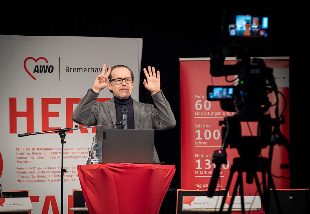 „Die Hälfte von uns wird im Alter pflegebedürftig“, verdeutlichte Moderator Eckart Kroon, Geschäftsführer der Unternehmensgruppe AWO Bremerhaven, die Brisanz des Themas für alle. Und weder die aktuelle Situation noch die Zukunftsaussichten stimmen zuversichtlich: Viele Anbieter sind vor den Kostensteigerungen in die Knie gegangen und mussten Insolvenz anmelden; es fehlen immer mehr Plätze für Tages-, Kurzzeit- und Langzeitpflege. Entgelt-Verhandlungen mit den Kostenträgern dauern zu lange, die Zahlungen von Sozialämtern kommen oft verzögert – vor allem kleinen Unternehmen können diese Finanzierungslücken nicht auffangen.
